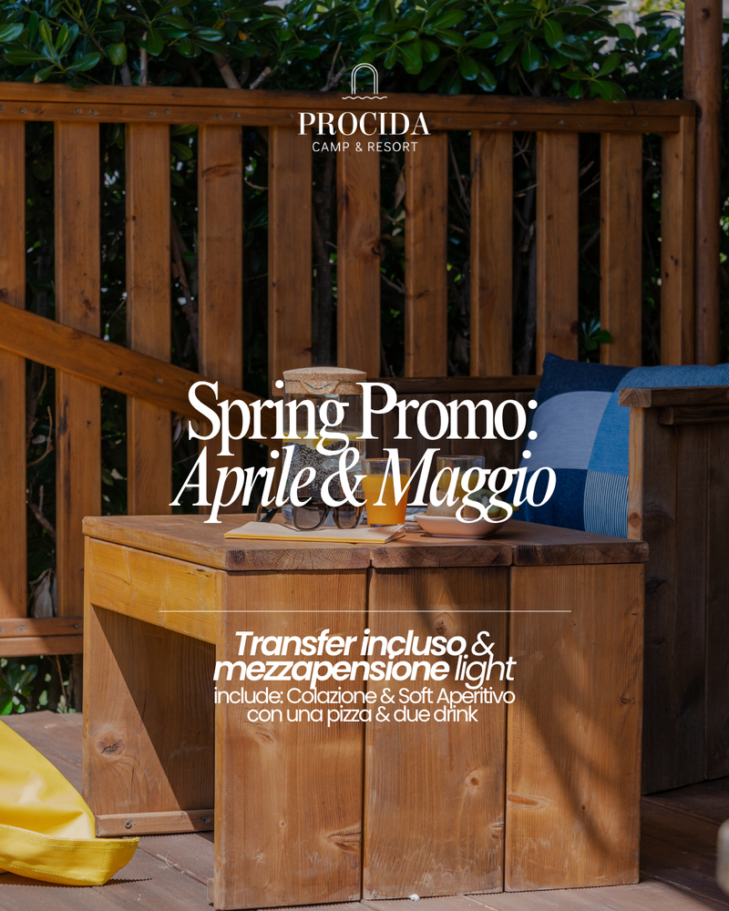 La primavera è il momento perfetto per scoprire l’essenza autentica di Procida, lontano dal caos e immersi nei profumi della natura in fiore. Con la nostra Spring Promo, valida per i mesi di Aprile e Maggio, abbiamo pensato a tutto noi per garantirti un soggiorno senza pensieri. Inclusi nel pacchetto troverai il transfer per raggiungere comodamente il Resort e l'esclusiva formula Mezzapensione Light: inizierai la giornata con una ricca colazione e la concluderai in bellezza con un Soft Aperitivo che profuma di casa, comprensivo di una pizza e due drink. Regalati una fuga rigenerante dove il comfort del glamping incontra la magia della primavera isolana.