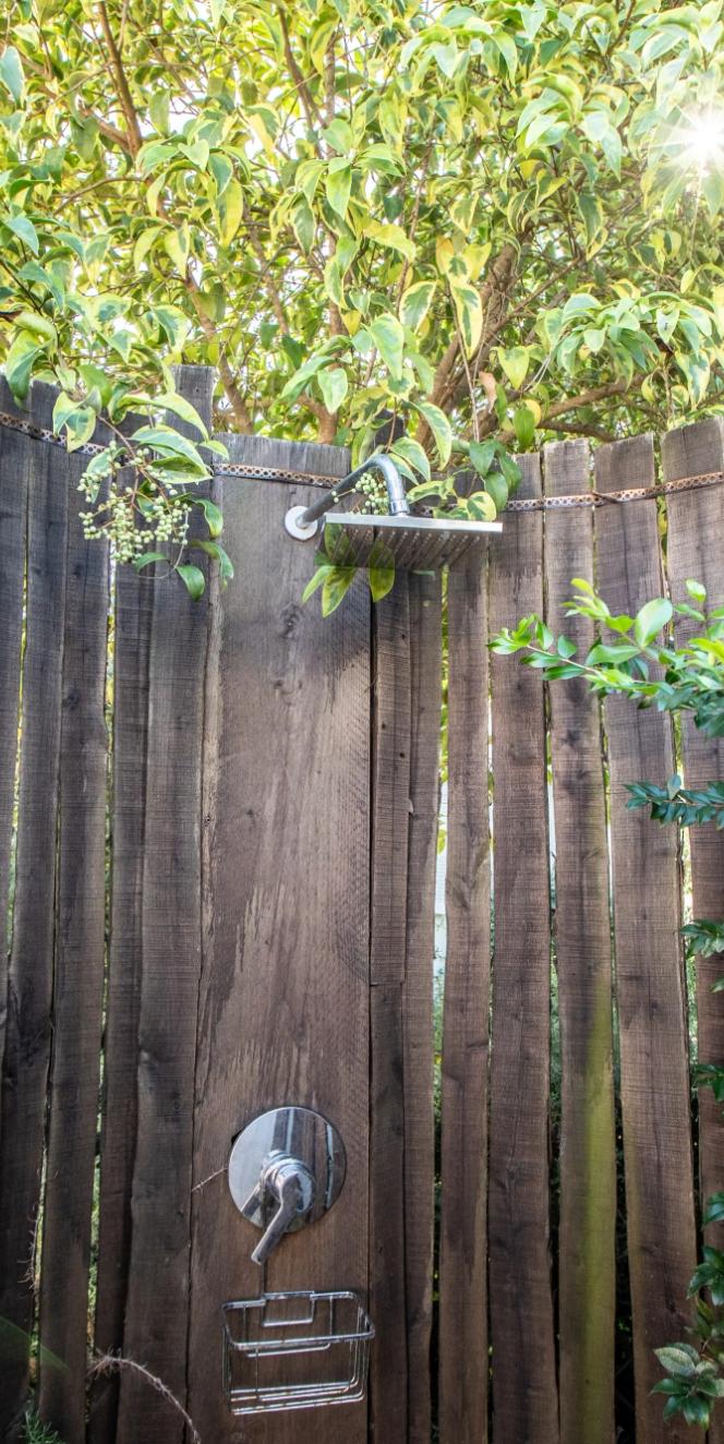 An outdoor shower in addition to the private bathroom with shower.
