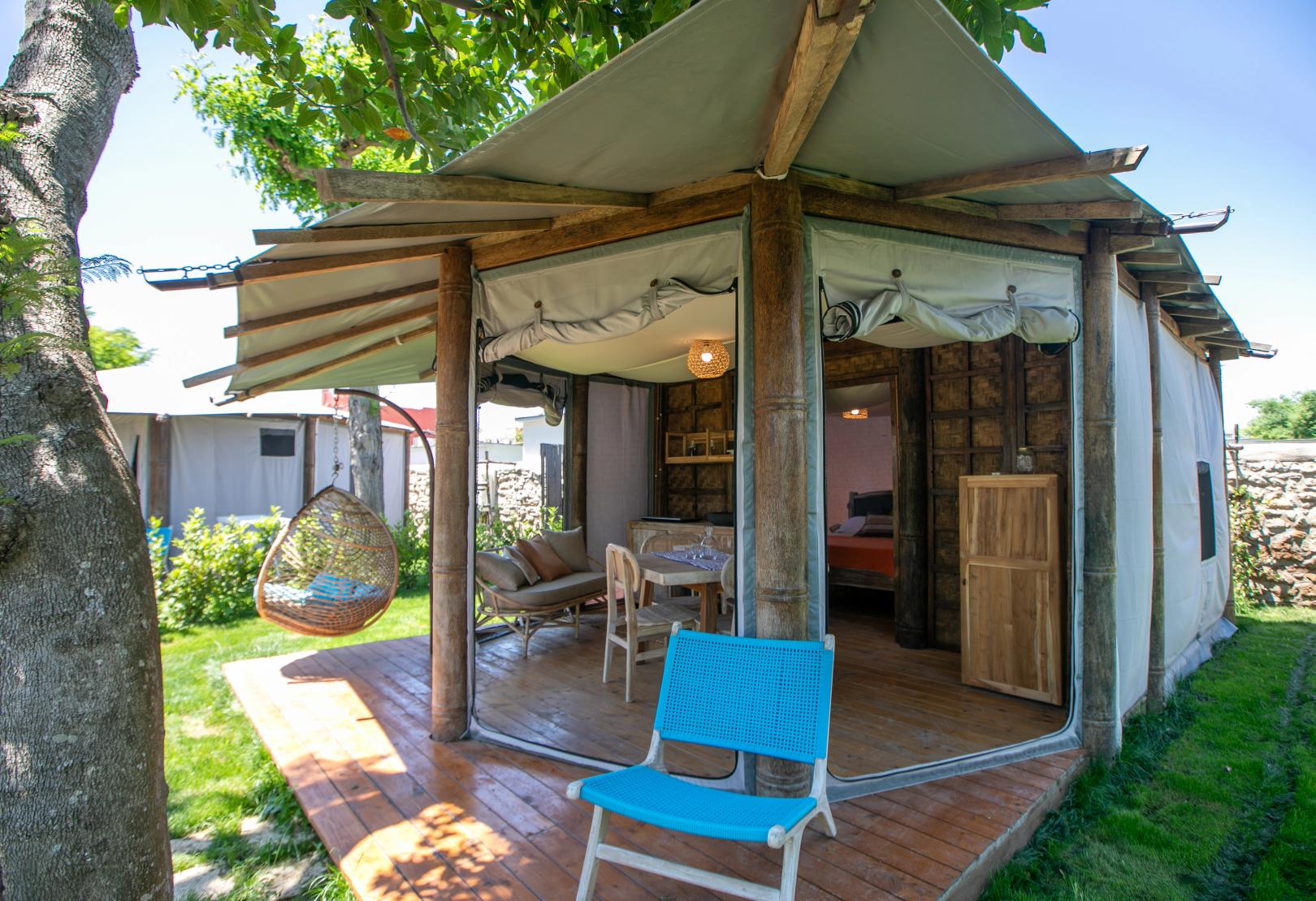Sleep at La Caravella Camp with every comfort and try this exclusive new glamp product only with us. The Indy tents are our outdoor answer to a hotel room but with a touch of glamp.