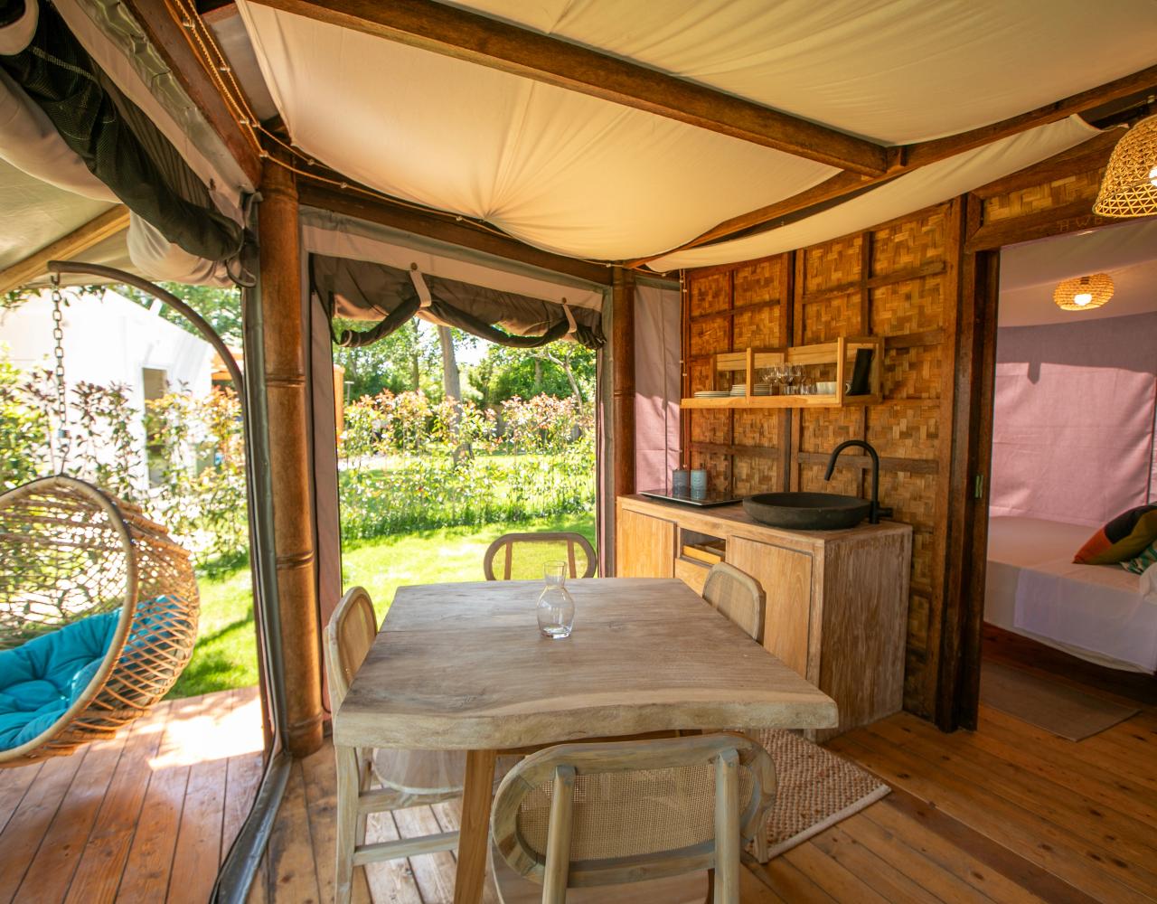 What more could you want from a tent? Kitchenette, bathroom with shower, air conditioning, private outdoor space. The charm of a minimalist interior with a touch of the exotic is sure to win you over. There are several Indy models, choose the one that suits you best!